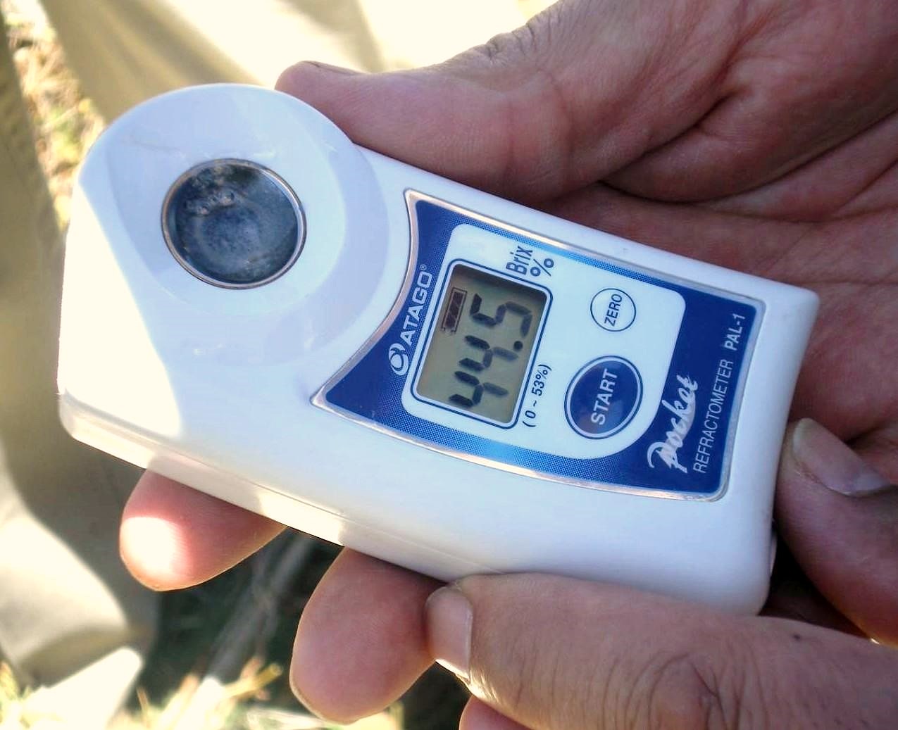 Murillo told me "this Extra Anejo is from our very own production of our own tequila, from our USDA certified organic agaves. We left a number of those barrels sealed (once-used Jack Daniels barrels), and they are now 14 years old. We bottled it at cask strength, in this case, 100 proof." We had a great long conversation, and knowing it's aged 14 years, my first question was "can you taste any agave at this point"? Adolfo Murillo was happy to answer, that yes you can... the agave does come through. Murillo explained that "the reason that so many years in oak did not overpower the sweetness of the agave, is because our organically-grown agaves have a much higher sugar content than conventionally-grown agaves. We are averaging 44 Brix units, measured in the field, and this gives us more of that agave sweetness and flavor in the tequila, and it still comes through after all those years in the barrels." Trust me when I tell you, that this is a tremendously high brix level (sugar content), and 44.5 is almost unheard of in the industry. Adolfo told me "what you see are 'sugars seeping', because when an agave has an extraordinarily high sugar content, the sugary juice begins to seep down the side of the plant, when fully ripe. This is a very rare sight to see anywhere else, but it is very common in our fields with our high sugar content." The pictures he sent me were unbelievable of the sugars oozing from the plants in the field, and the testing done out in the fields on these agaves. These are not pictures you see often of harvested agaves (SEE BELOW).