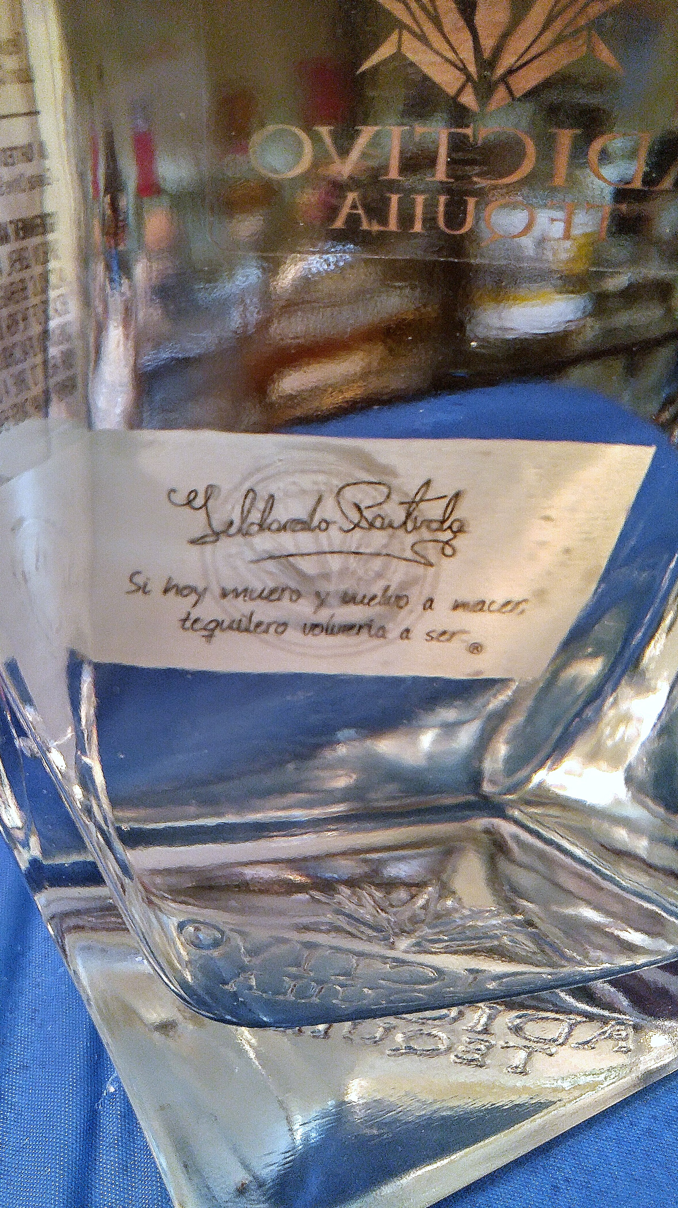 A message seen from the inside (BELOW) of Adictivo loosely says "if today I die and I'm born again, I would be a tequilero."