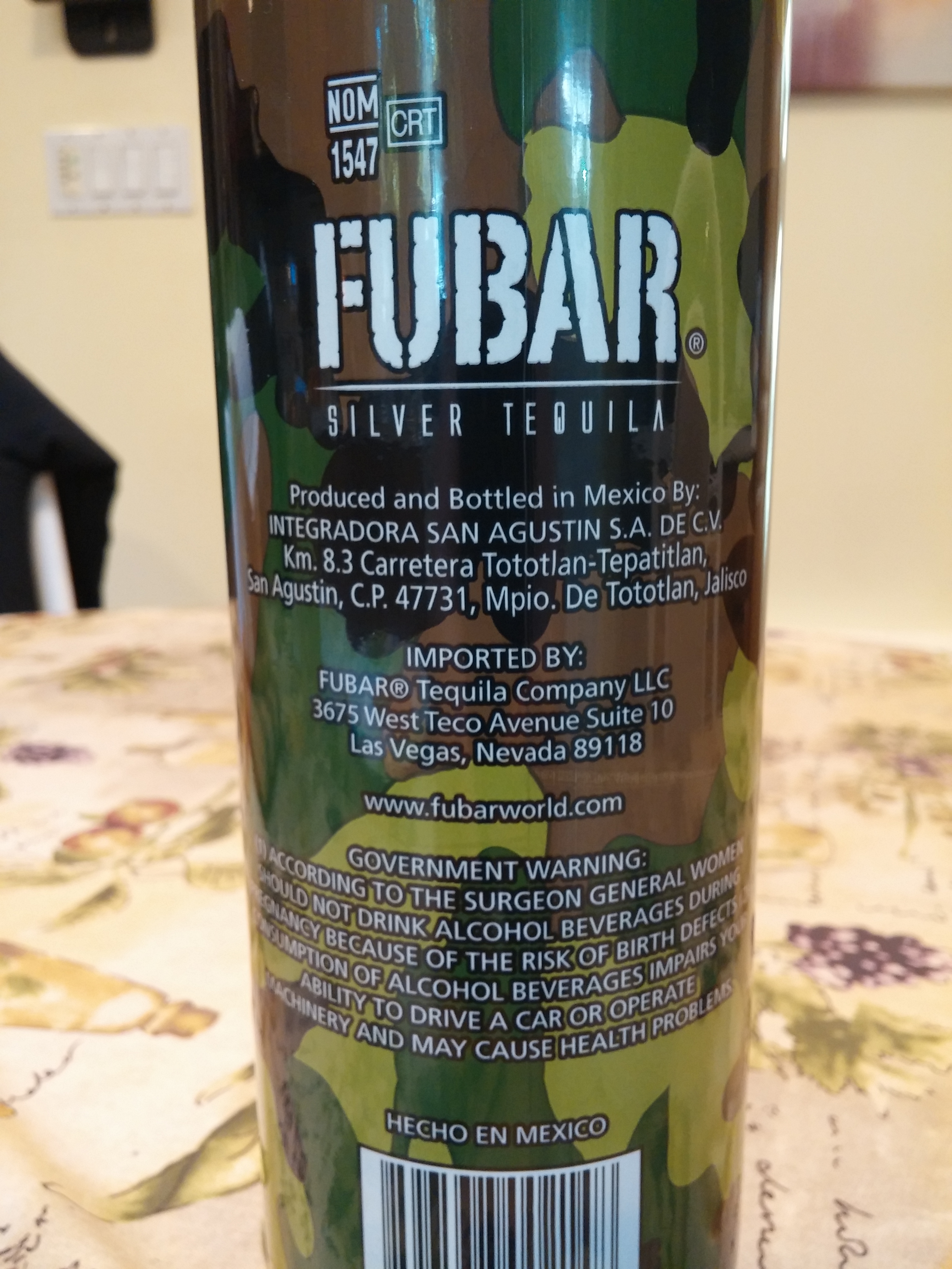FUBAR Tequila was founded by George Harris and legendary Rogue warrior and "Shark Man of the Delta"- Commander Richard Marcinko, a retired Navy SEAL Commander and Vietnan War Veteran. FUBAR is produced at Integradora San Augustin S.A. DE C.V. in Jalisco- NOM 1547 in the highlands (Los Altos) of Jalisco, in Tototalan. The brand is owned by the Fubar Tequila Company of Las Vegas, Nevada, and you usually see it advertised along with pretty, scantly clad women often in camouflage, hanging out with George and Commander Marcinko in the fun Las Vegas atmosphere.