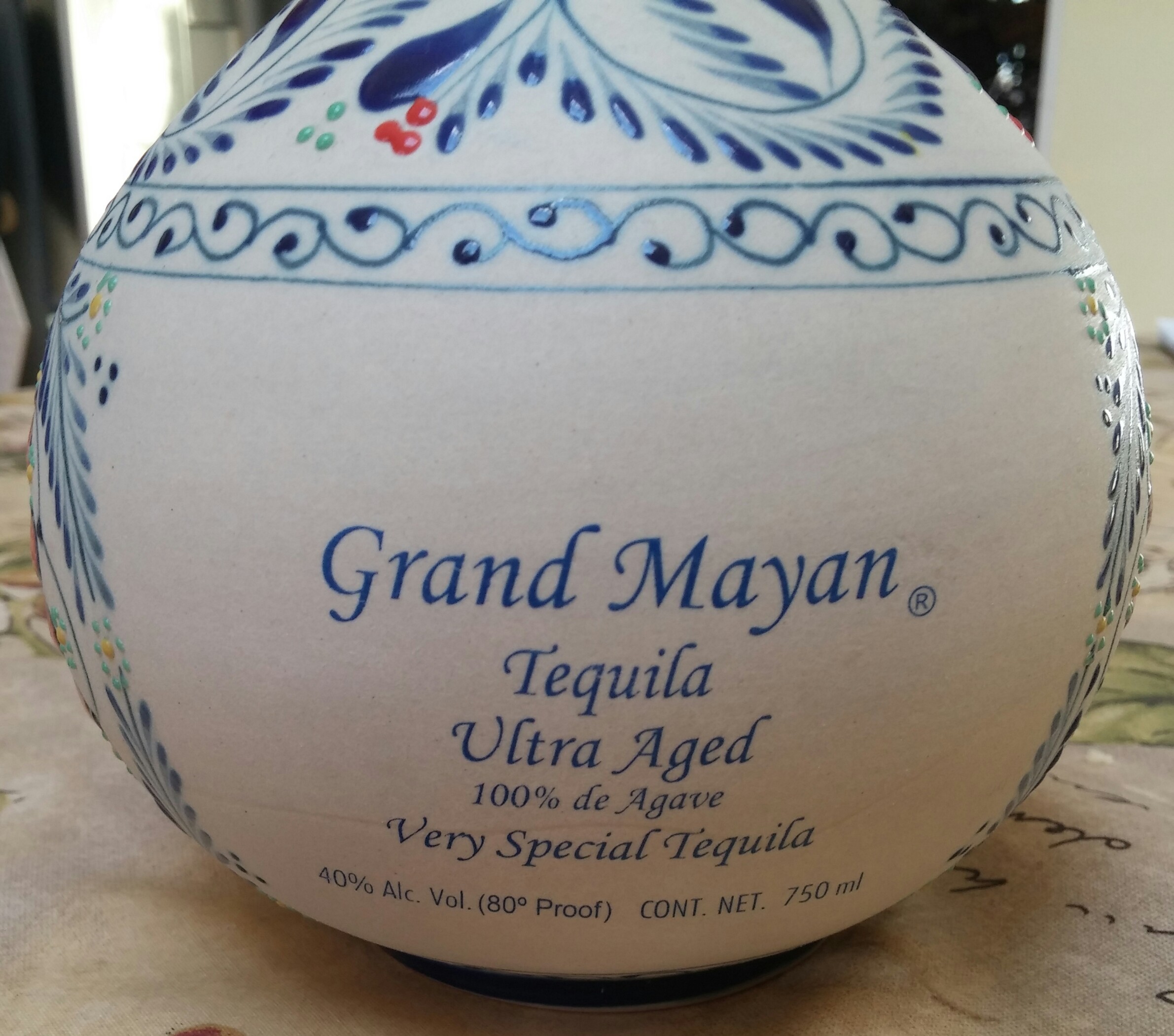 Grand Mayan Ultra Aged Tequila (80 proof) is presented in possibly the most beautiful hand made and painted talavera bottle available, and the tequila does not disappoint. I LOVED the taste and this Extra Añejo is now one of my favorite Extra Añejos of ANY price. Especially at the reasonable price of $75-80 a bottle, it's up there with the best of them, although I would have liked more agave presence and boldness, mainly in the nose. It's delicious, tasty, and so very easy to drink, that even my wife loved it, and she's NOT a tequila lover (I'm in trouble now). It is extremely smooth and silky, and has a definite cognac presence, with a nice chocolate/caramel smoothness that does eventually give a burst of agave. It is the darkest, richest looking XA that I have ever seen. WOW!!