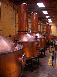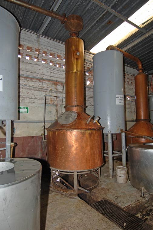 Distillation normally occurs in the 'Alambique', also known as 'pot stills' (See Above), which consists of three parts- the 'cucurbit' (the stack), the 'still pot' (containing the liquid to be distilled, which is heated by a flame) and the 'head' or 'cap', which fits over the mouth of the cucurbit, (connected by the anbik section) to receive the vapors, and is attached to a downward-sloping 'tube' leading to the 'receiver' container. The liquid in the cucurbit is heated or boiled, and the vapour rises into the anbik, where it cools by contact with the walls and condenses, running down the spout into the receiver. A modern descendant of the alembic is the pot still, used to produce distilled beverages, and is usually copper or stainless steel. Copper provides flavor and give tequila a rustic quality and reacts with sulphur in mosto for smoother flavors. Stainless steel provides an elegant, clean finish. Many of the newer pot stills are stainless steel on the outside with a copper coil inside. Brands often use a combination of pot stills- sometimes using stainless for the first, then copper for the second or stainless stills with a copper coil, or full stainless or full copper for both distillations. Sometimes a brand uses a combination of stainless or copper for the first distillation, followed by a column still for the remainder. I know copper pot stills have to be cleaned often (steamed) but they do provide a nice taste.