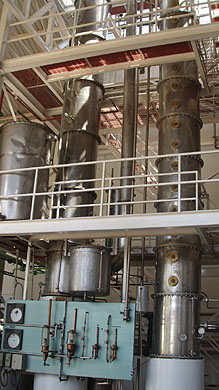 As mentioned, sometimes a column still, also known as a 'Coffey still' may be used (See Below), and depending on how many plates are installed, are known as continuous distillation. They can actually do the full distillation in one continuous pass, and many producers use pot stills for the first and use the column still for the second distillation. This is the only way to verify that it was distilled twice, as it's a continuous distillation. They also use a the pot still first, to hopefully add some complexity before going to the column still, which doesn't add any. Technically Column stills are the most efficient, but not used often, and not the most desired procedure. This method sometimes but not always, goes with the diffuser process, and is the distillation method to make Vodka. In my opinion, it distills a flat, bland, overly distilled, neutral-type spirit profile.