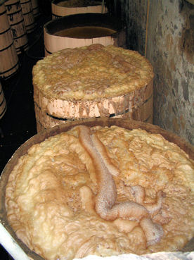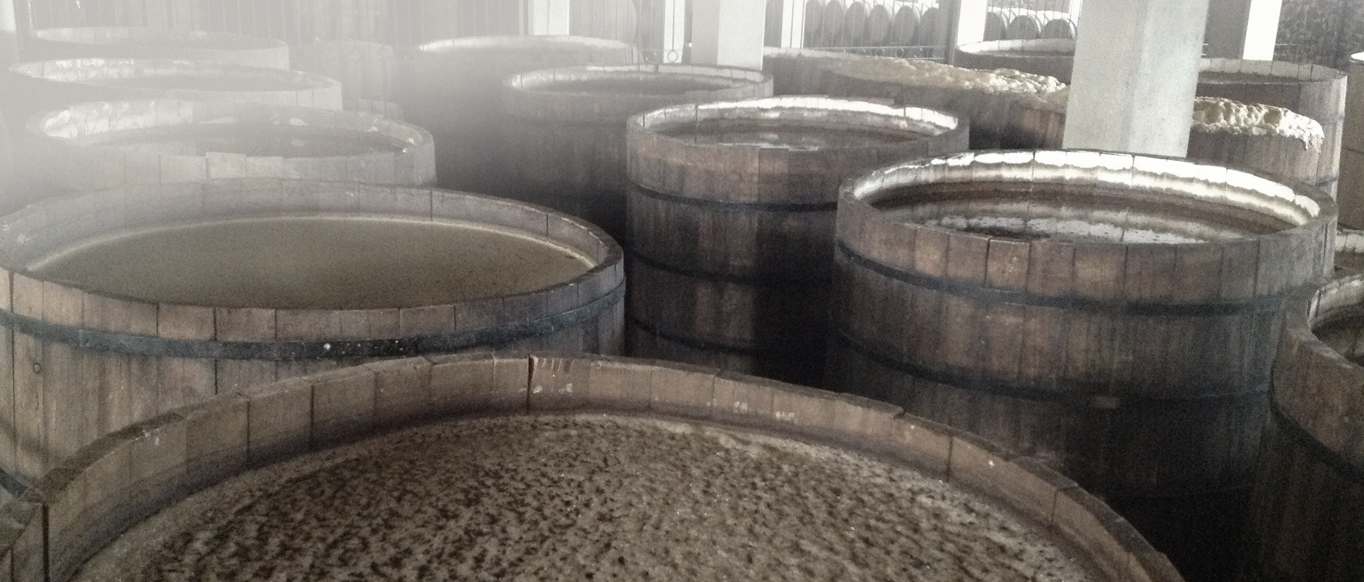 BELOW- stainless steel, wooden, and cement/stone fermentation vats (tanks).